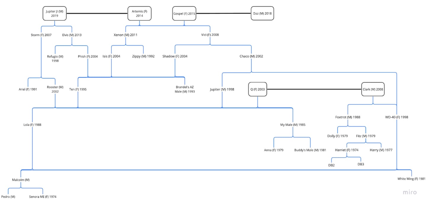 Many captive-bred Harris's Hawks have traceable bloodlines these days. Much of these are stored and found on Baywing database. https://baywingdatabase.com/ This is run by Jenn Coulson, and was developed by Toby Bradshaw. This is one of the greatest gifts ever made to our Harris's Hawk community. Here you can find out about your hawk's parents and grandparents and so on. You can see what they hunted, for how long, and how successfully.
