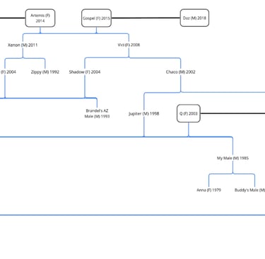 All of the birds you'd get from me are descended from the famous "white-wing line," but around half of the hawks in Baywing database are descended from this famous female. An important metric, but not the only one of importance. The route to each of the birds' individual lineages is convoluted enough that I've included a family tree below for the three pairs currently in the project. The highlights for me are that the best female I have ever flown came out of a pair owned at the time by Toby Bradshaw, Xenon and Vici. Vici has her own page dedicated to her on the Baywing database website, and continues to breed, now owned by Tom and Jenn Coulson. And the best male I've ever flown came out of a pair owned at the time by Tom and Jenn Coulson, Elvis and Storm.
