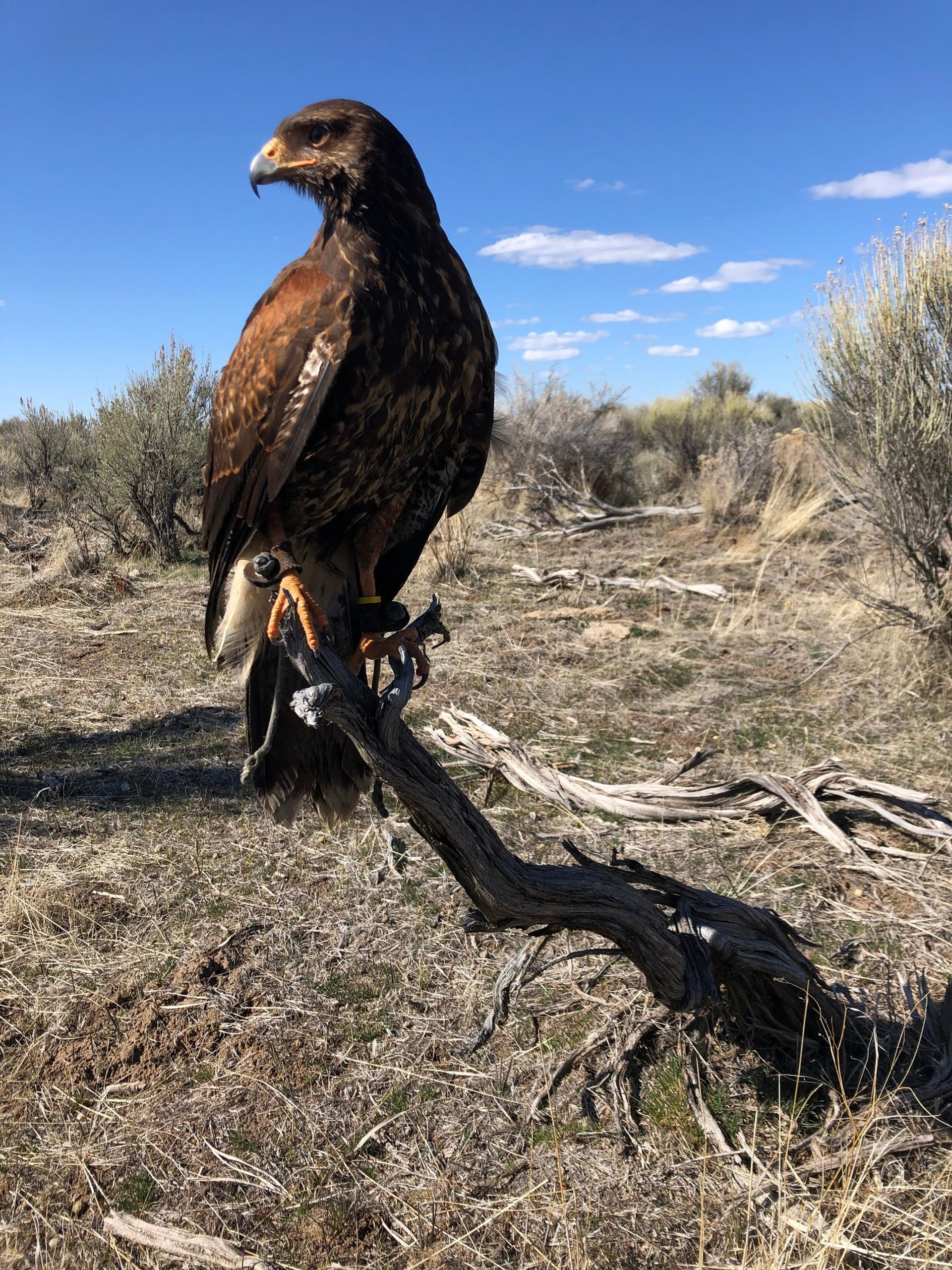 Another thing to think about on this front is socialization. A bird taken earlier will accept your specific dog quicker. And it will bond with your other Harris's Hawks quicker if you have a cast-mate already. If you don't have another Harris's Hawk though, and you hope to fly this bird in a cast some day, you should leave the bird with its parents and siblings as long as possible to socialize them that way. They won't be socialized to your specific bird, but they will learn their Harris's Hawk manners.
